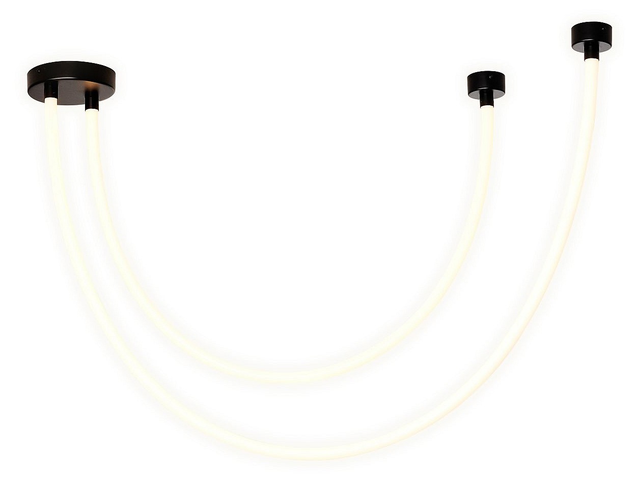 потолочный светильник, потолочное крепление из металла черного цвета, из которого выходят две длинные гибкие силиконовые трубки, выполняющие роль светового элемента, благодаря встроенному в них источнику LED. Меняя точки креплений на концах трубок можно создавать различные вариации светильника. Потолочный светильник Pipelinе сложно охарактеризовать обычными словами, настолько это отличается от традиционных представлений о люстрах. Здесь присутствует потолочное крепление, из которого выходят две длинные гибкие силиконовые трубки, которые и выполняют роль светового элемента, благодаря встроенному в них источнику LED. Меняя точки креплений на концах трубок можно создавать различные вариации светильника.